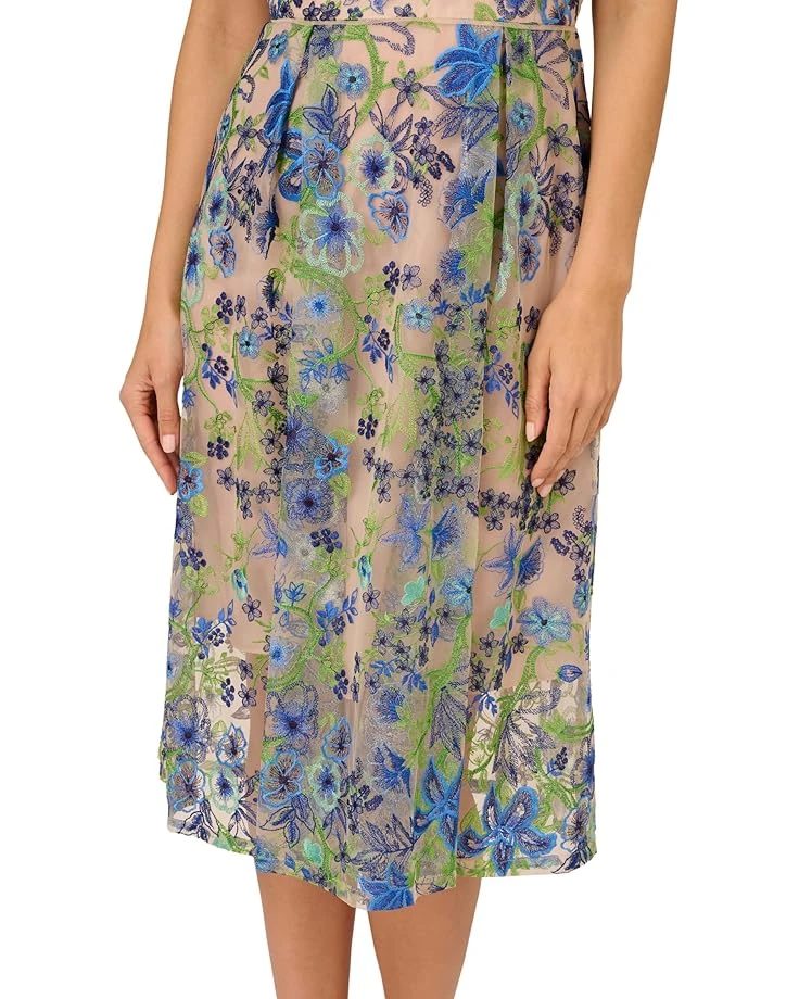- Whether you are headed to a cocktail party or a dinner date, the Adrianna Papell® Embroidered Fit and Flare Dress beautifully complements your elegant personality while ensuring that you do not lose comfort. Framed in an iconic fit-and-flare silhouette, this sleeveless dress features a mock neckline with a zippered back closure and highlights an intricate floral embroidery work all over for a unique appeal. The flared skirt showcases gentle pleats for added movement and swing and finishes slightly below the knee.
