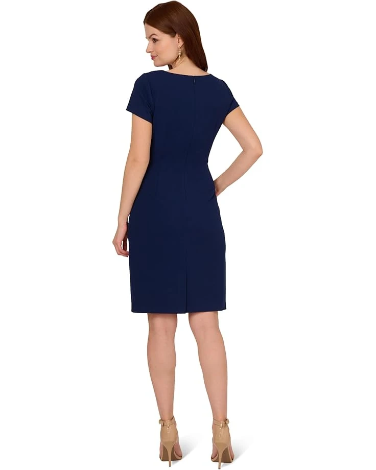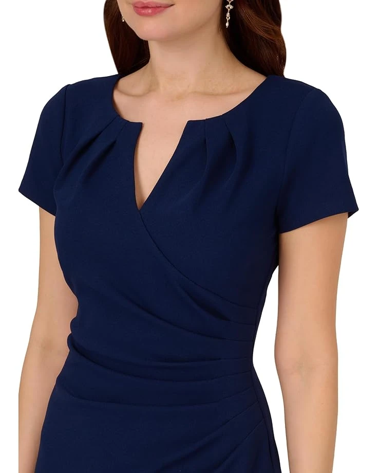 - Your day just got more stylish with this Adrianna Papell® Knit Crepe Draped Midi Dress in the mix. This dress features a notched neckline, short sleeves, and a sheath skirt. Crafted from knit crepe fabric, this wear-to-work dress has a good amount of stretch and no waist seam for a comfortable fit. Pleated details at the shoulders and draping through the body add style to this short sleeve dress. A hidden zipper closure at the center back of the dress completes this midi dress.