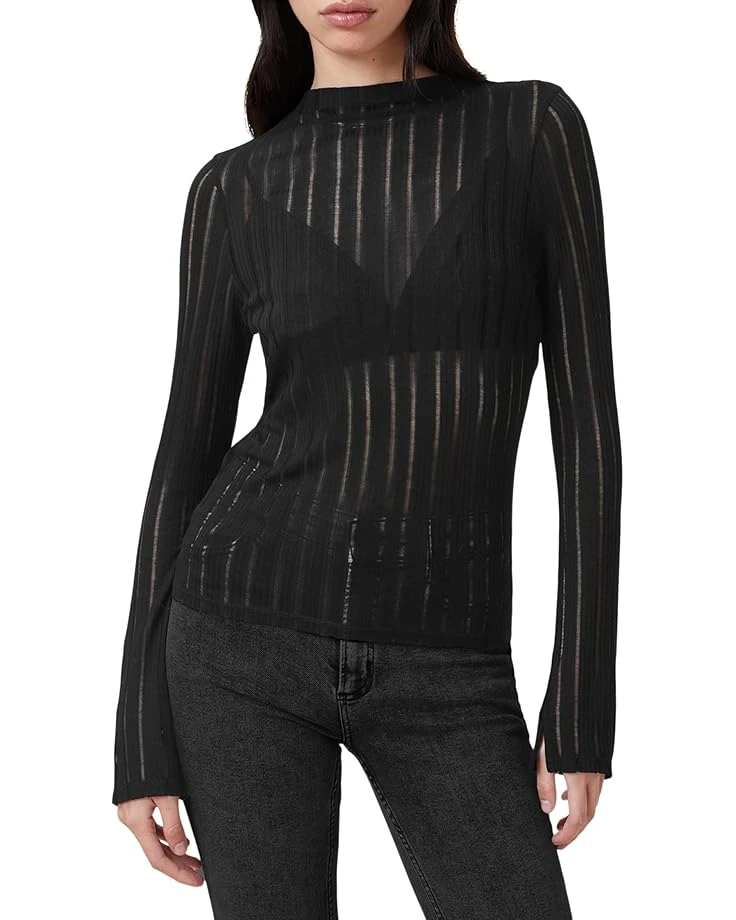 - Look effortlessly stylish wearing the AllSaints™ Aki Long Sleeve Tee. With its unique funnel neckline, long sleeves slightly flared at the cuffs, ladder stitch detailing, and straight hem, this tee is perfect for any casual outing or a cozy night in.