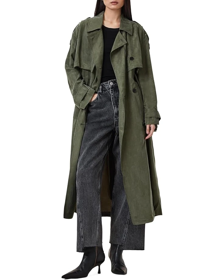 - Make a statement wearing the AllSaintsâ„¢ Linnie Trench coat. With its classic notched lapel collar, stylish long sleeves with belted cuffs, and an adjustable removable tie belt, this coat offers both sophistication and versatility. The gun flap detail and buttoned front closure provide a touch of urban edge, while the storm flap and back vent deliver practicality and comfort.