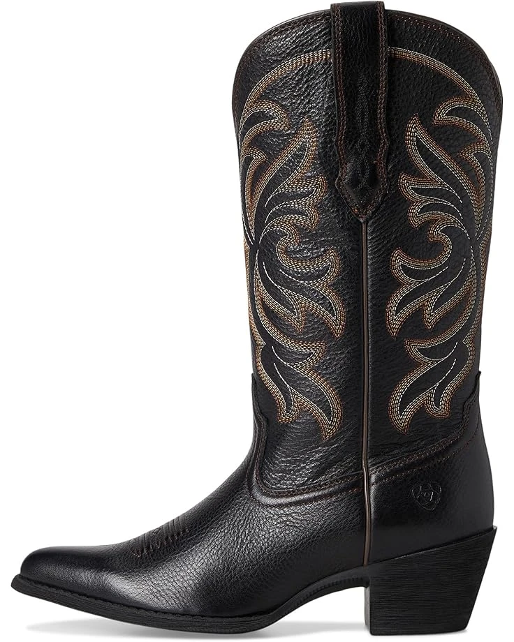 - Take on any terrain with confidencewearing the Ariat® Heritage J Toe Stretchfit Western Boots. The leather upper and lining provide durability and style, while the removable all day cushioning insole ensures all-day comfort. With a six-row stitch pattern and ATS® technology for ergonomic support, these boots are perfect for those long days on your feet. Plus, the StretchFit panels under the pull tabs give you an additional inch to fit a wide range of calves.