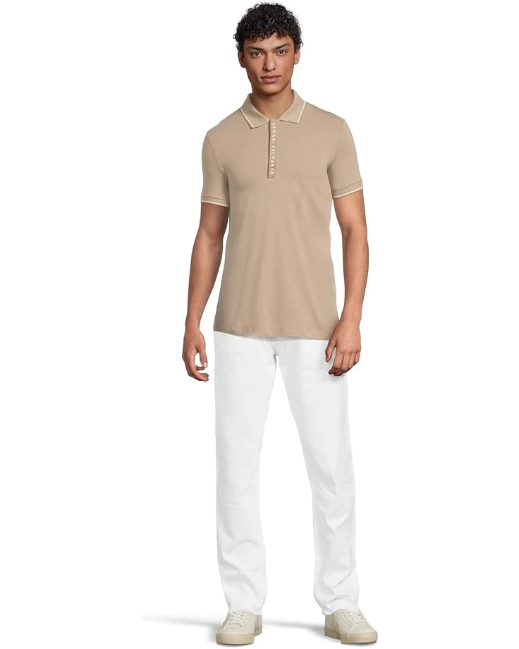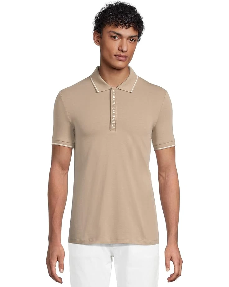 - Amp up both sophisticated style and casual comfort wearing Armani Exchange® Logo Placket Polo, crafted with a luxurious cotton blend fabric. The pull-on style polo shirt features a classic collared neck with signature brand logo detail, a hidden zipper closure, short sleeves, and a straight hem.