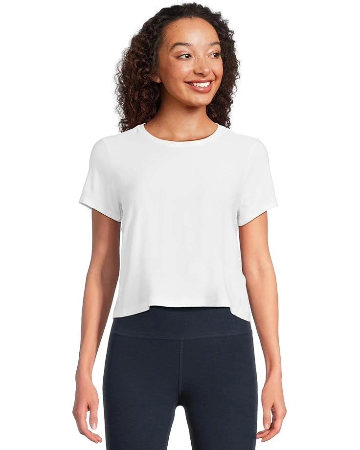 - Light as air, undeniably chic: The Beyond Yoga® Featherweight Supreme Cropped Tee redefines everyday comfort. Featuring a soft, featherlight fabric, this pull-on tee offers effortless style with a relaxed fit and short sleeves. Its design pairs perfectly with high-waisted pants or leggings for a flattering silhouette. Top of the tops. Our simple, straightforward, and completely essential cropped tee with a loose, relaxed fit for cool-without-even-trying comfort. Wear yours to work, weekend plans, and everywhere in between.