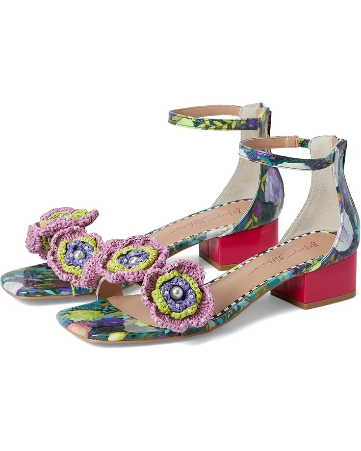 - Perfect for any fashionista, the Blue™ by Betsey Johnson Brandee heels are sweet and girly with their flower embellishments. The adjustable ankle strap ensures a perfect fit. These heeled sandals have a faux leather upper, insole, and lining.