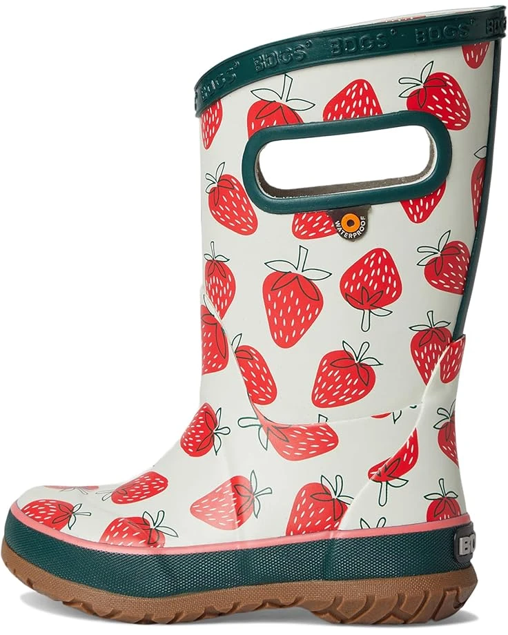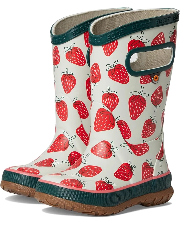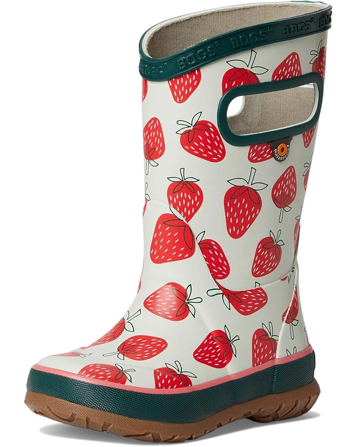 - Let your little one enjoy in muddy puddles wearing the Bogs® Kids Rainboot Strawberries. Crafted from rubber upper, fabric lining, and polyurethane insole, this pair of boots features round toe, DuraFresh natural bio-technology activates to fight odors, BOGS Max-Wick evaporates sweat to keep feet dry, Bio-based footbed provides comfort while minimizing environmental impact, lightweight construction, and easy on handles.