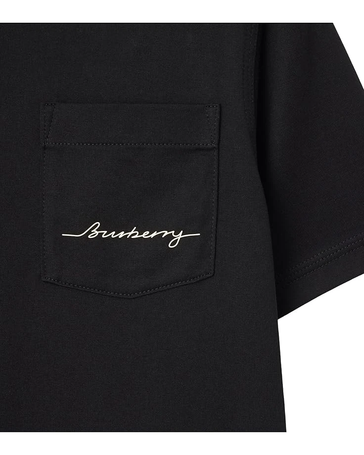 - This Burberry® Kids Cedar Logo Script T-shirt is perfect for your little one! Made with a ribbed crew neckline, short sleeves, and a classic fit, it’s both comfortable and stylish. The pull-on style makes it easy for kids to put on themselves. Plus, the patch pocket on the left chest with the brand logo script adds an iconic touch.