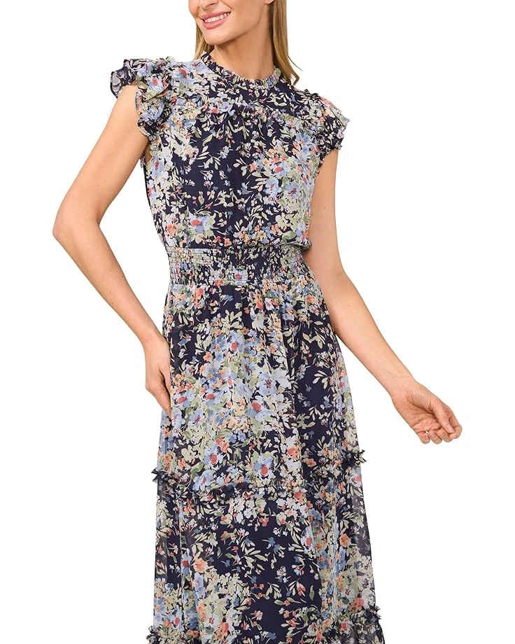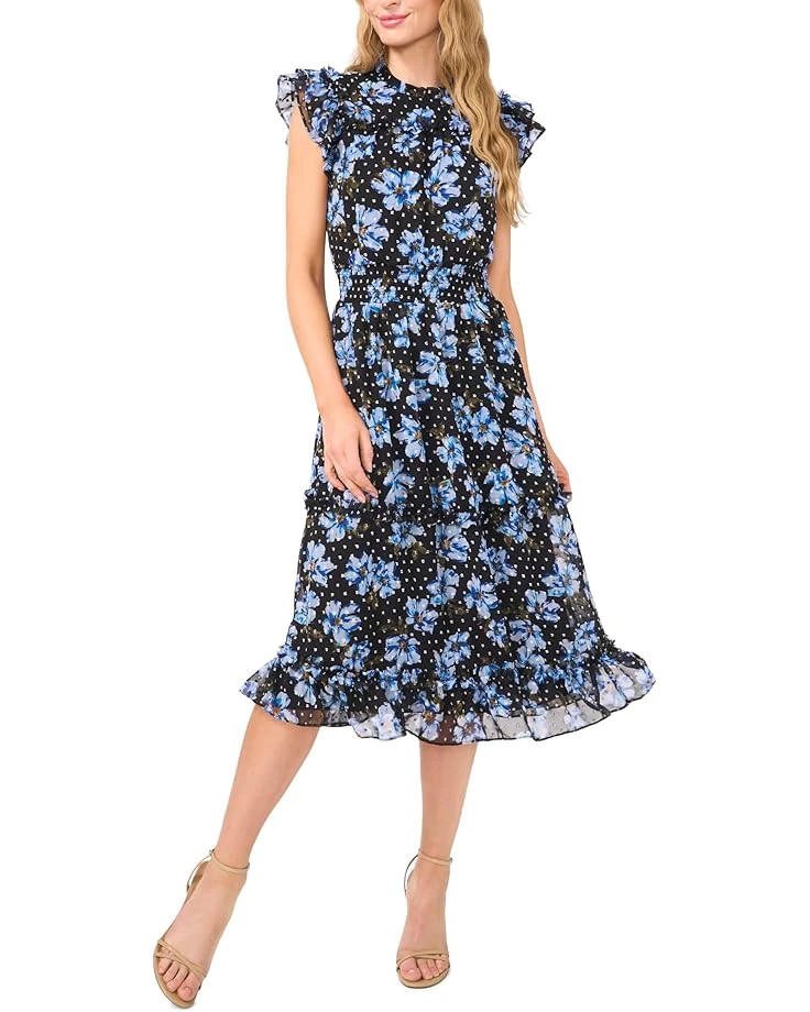 - Donne a cute look wearing CeCe™ Flutter Sleeve Smocked Waist Midi Dress, crafted from a soft, breathable fabric. The A-line dress features a mock neck, short flutter sleeves, a clip dot closure on the back, a smocked waist for a flattering silhouette, and a below-the-knee length. The exquisite allover print adds a striking detail and the cinching in just the right place enhances your natural curves while providing a comfortable fit.