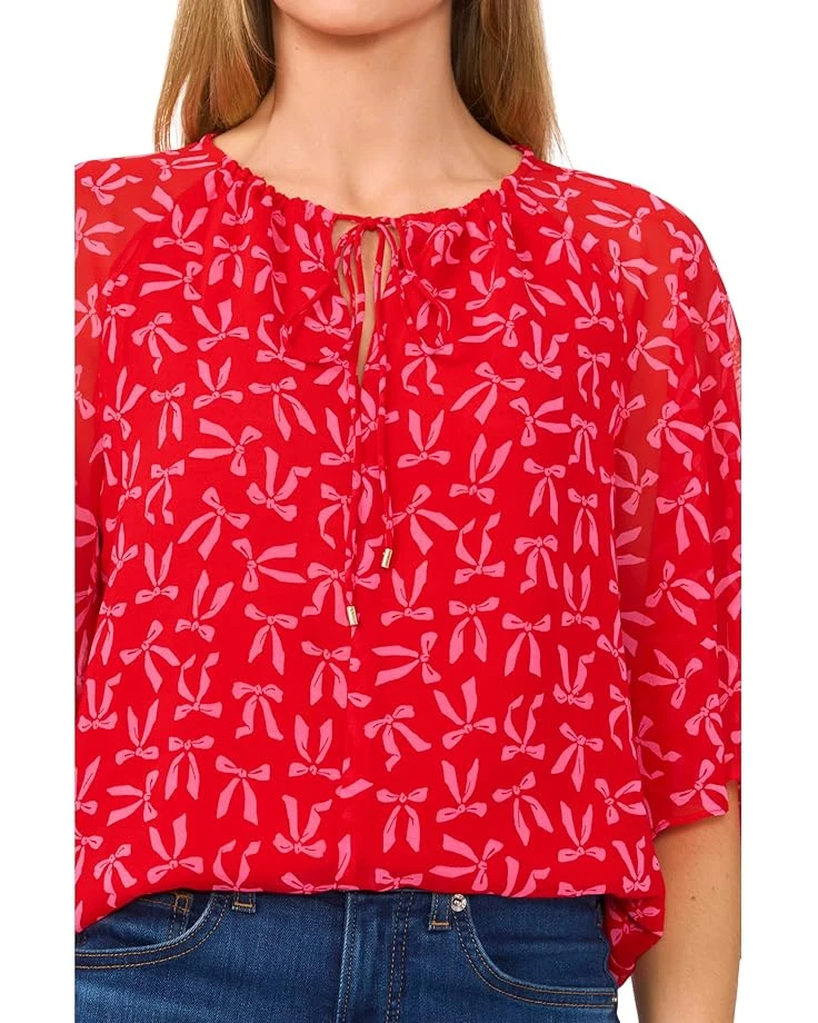 - The CeCe™ Tie Neck Raglan Sleeve Top blends classic charm with modern flair. Crafted from airy gauze chiffon, its whimsical bow print brings a lighthearted touch to your wardrobe. The tie-neck detail offers customizable styling, letting you seamlessly transition from casual outings to chic events. Designed with quarter-length raglan sleeves and a flattering classic fit, this pull-on top ensures all-day comfort and effortless style