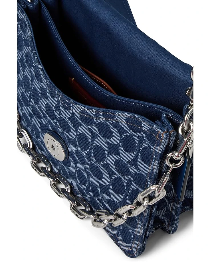 - Carry your dignity with the COACH™ Chain Tabby Shoulder Bag In Signature Denim. Crafted from cotton, and leather, this bag features magnetic snap closure, one detachable chain strap, one detachable shoulder strap, one detachable, adjustable crossbody strap, interior snap and interior multifunction pockets. It comes with one exterior zippered pocket, and brand detailing on the front..