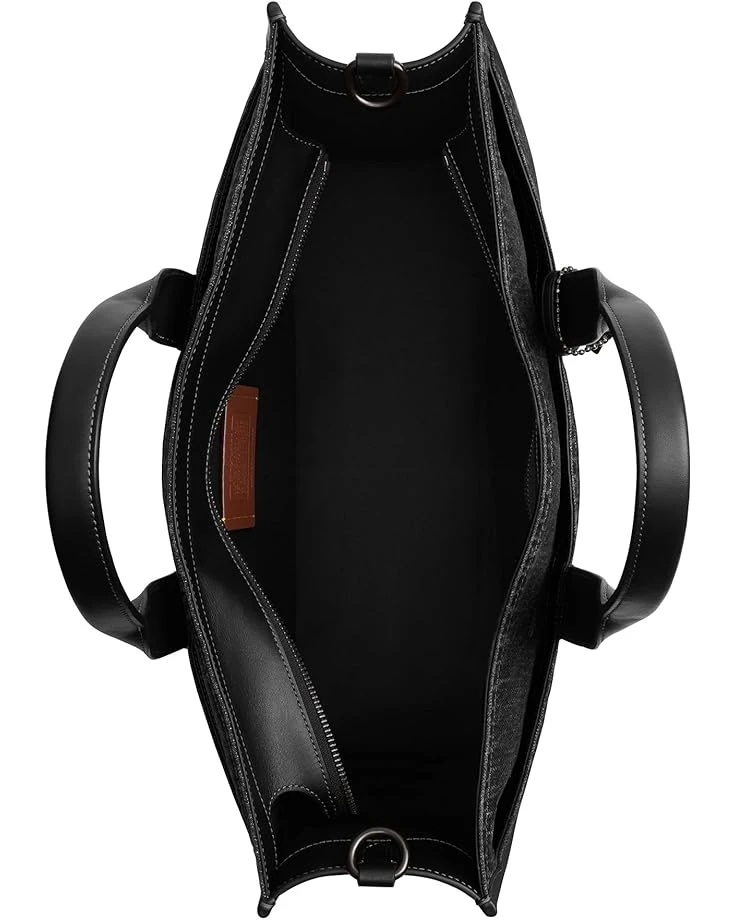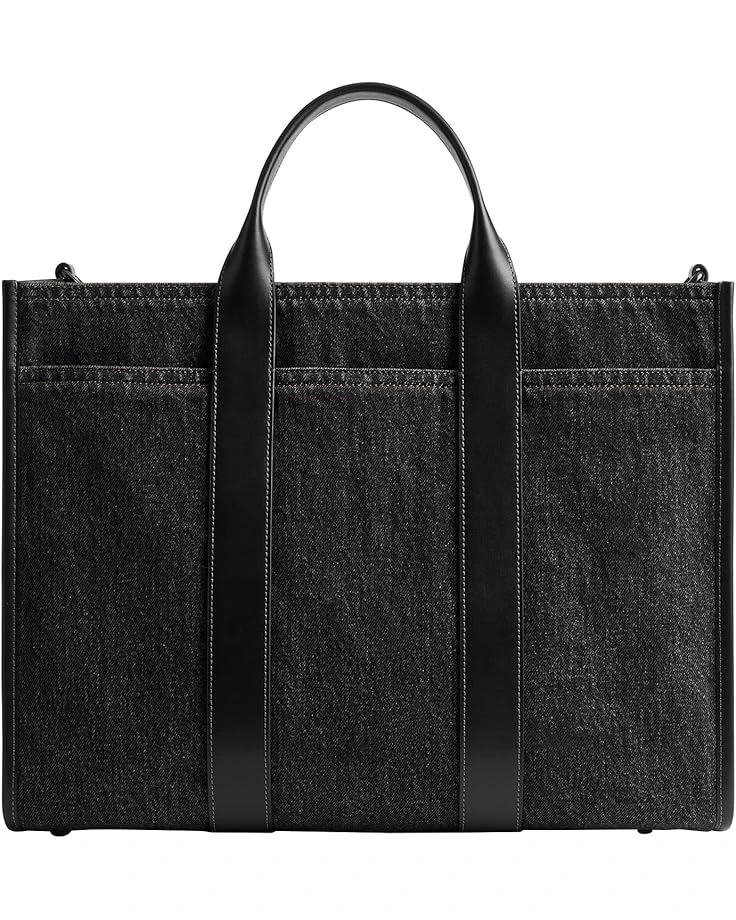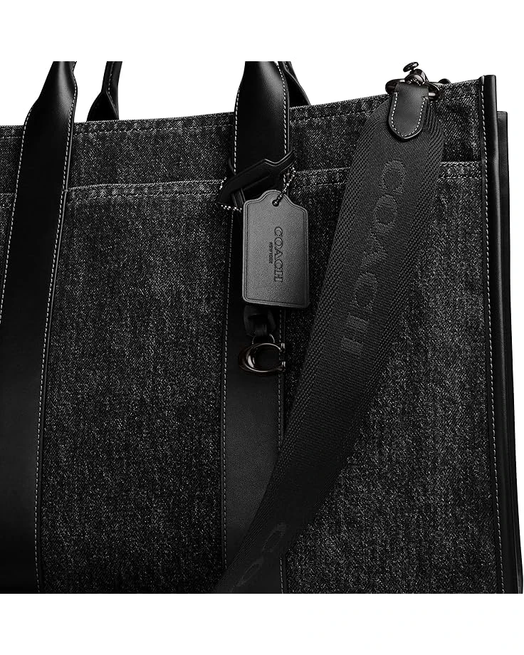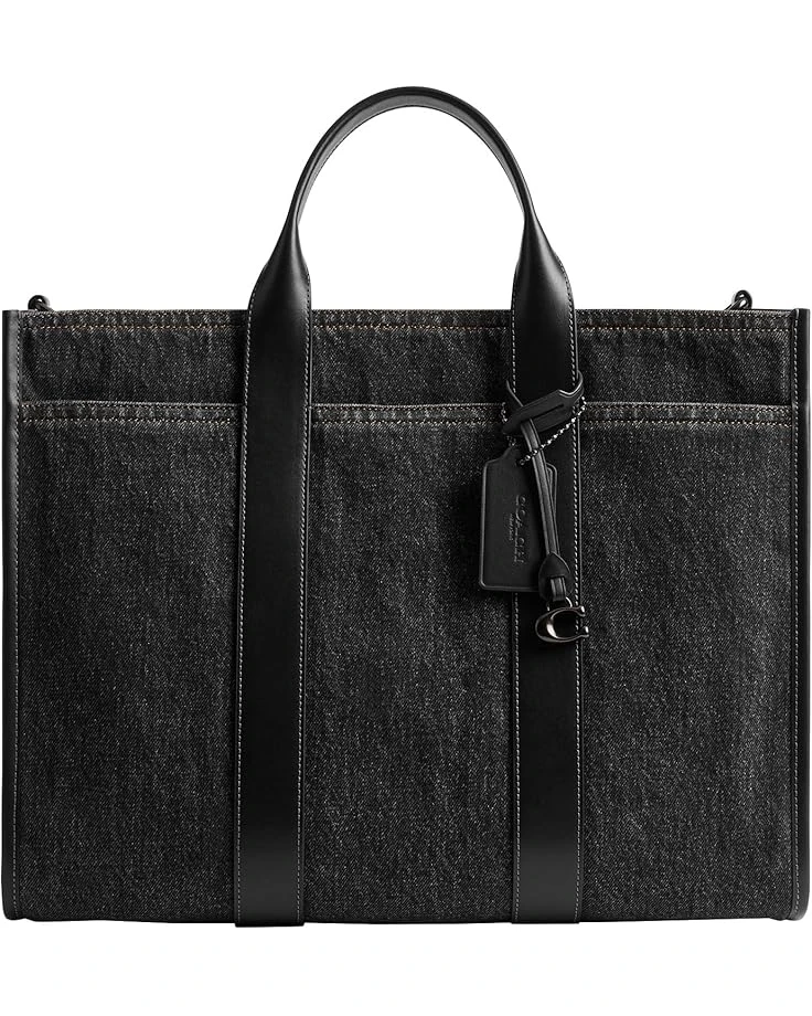 - A touch of timeless: The COACH™ Wesley Tote in Denim. Crafted from luxe denim and refined calf leather for the perfect blend of casual elegance and polished sophistication. Designed for both function and fashion, it features a zippered top closure to keep essentials secure, a spacious dual-compartment interior with an inside zip pocket for organization, and a fabric lining for a smooth finish. Carry it your way with sturdy handles or the detachable strap for hands-free versatility. An exterior magnetic snap pocket offers quick access, while four protective feet keep it pristine.