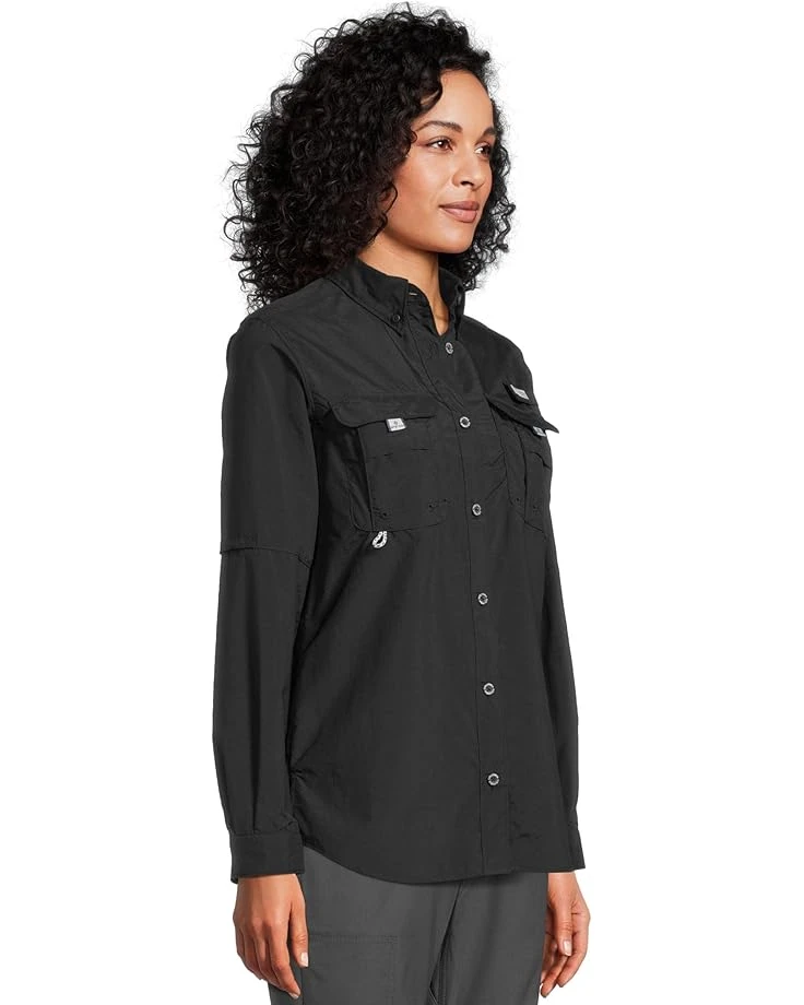 - Embrace the class wearing the Columbia® Bahama™ II Long Sleeve. Made from Omni-Shade Broad Spectrum UPF 50 sun protection fabric which is quick-drying. Featuring collared neckline, button front closure, long, rolled-up sleeves with button cuffs, two chest pockets, and curved hem.