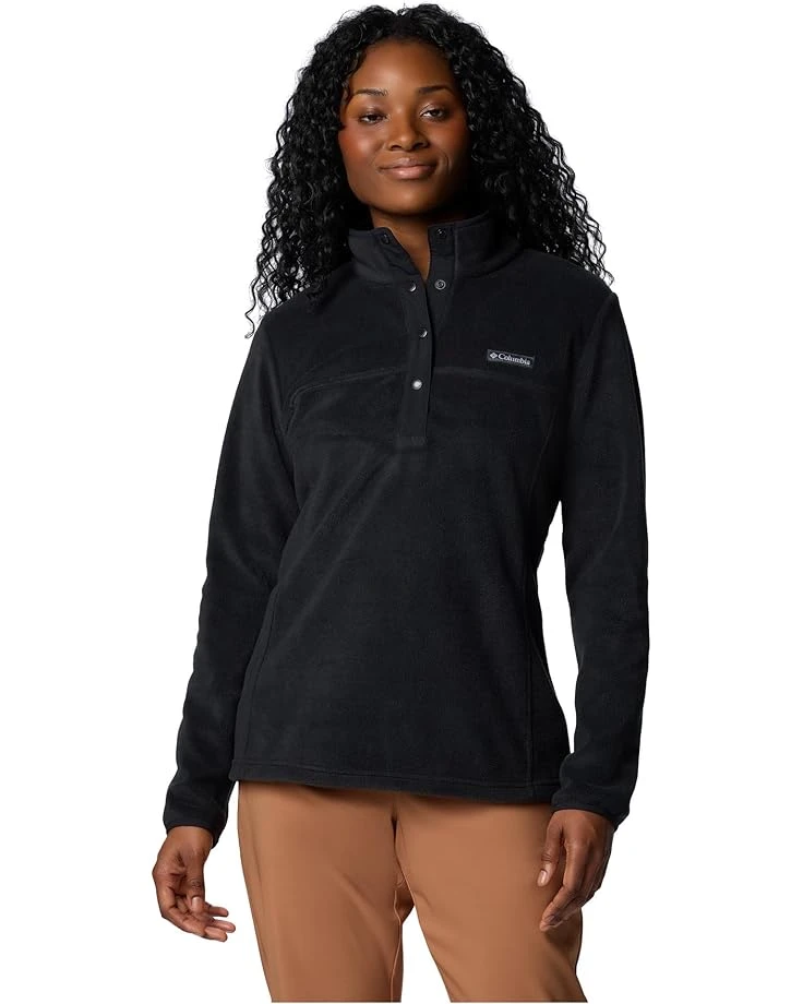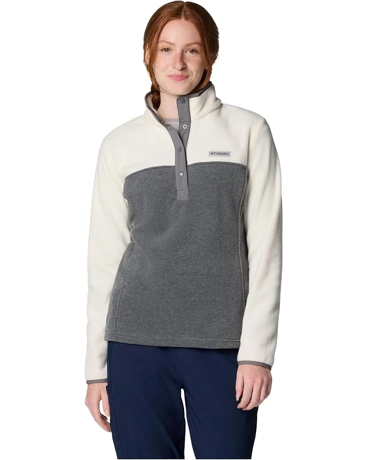 - Cozy up in style-your go-to layer for every adventure! Embrace the chill wearing the Columbia® Benton™ Springs 1/2 Snap Pullover II, designed for warmth and comfort. Featuring a binding collar and a snap-zippered front half closure for easy wear, this long-sleeve, pull-on fleece is perfect for layering. Crafted from ultra-soft fleece, it offers reliable warmth during those cool morning hikes or evening bonfires. The classic fit ensures comfort, while the versatile design keeps you looking effortlessly stylish.