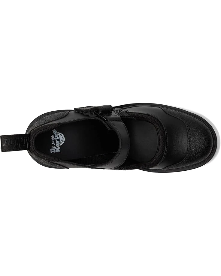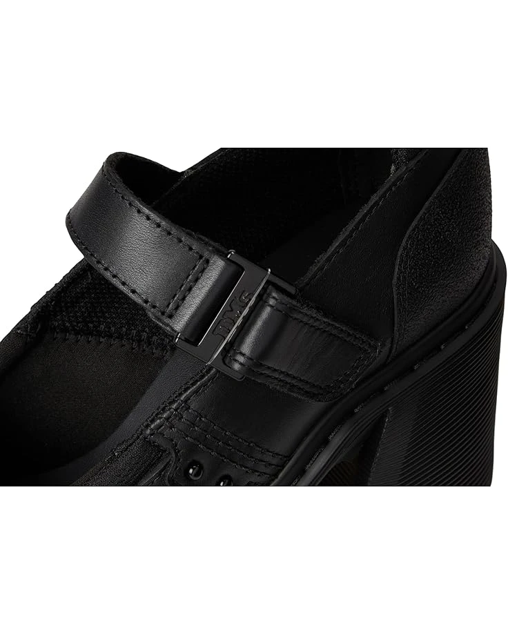 - This Dr. Martens® chunky heeled shoe is designed with wide, flat straps to add an alternative appeal. Featuring an elevated Mary Jane silhouette, the shoe features an adjustable strap fastening, a flared heel and a deep cleated sole. In a monochrome style, the shoe is finished with an all-black rubberized heel tab and tonal welt stitching.