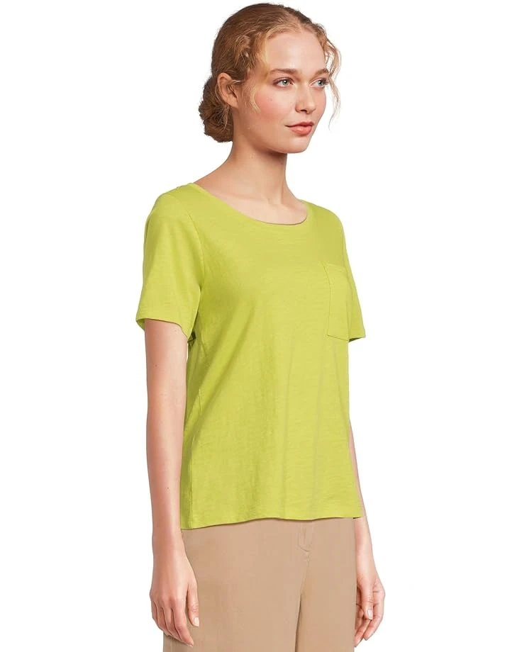 - Introducing the Eileen Fisher® Scoop Neck Tee. Soft and light, it is an organic cotton jersey with a visual texture from very fine slub yarn. Now grown using regenerative farming methods that support soil health and biodiversity. It features a scoop neckline, short sleeves, and a straight hem.