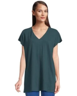 - Unwind in style and comfort wearing the Eileen Fisher® V-Neck Tunic. This crinkled jersey is made from cotton blend fabric in a soft textured knit, featuring V- neckline, short cap sleeves, standard length, relaxed fit, and pull-on style.