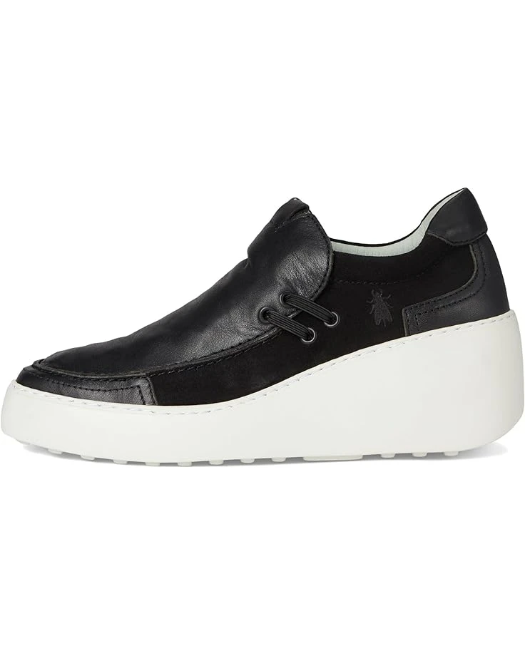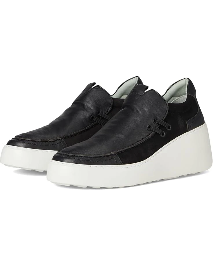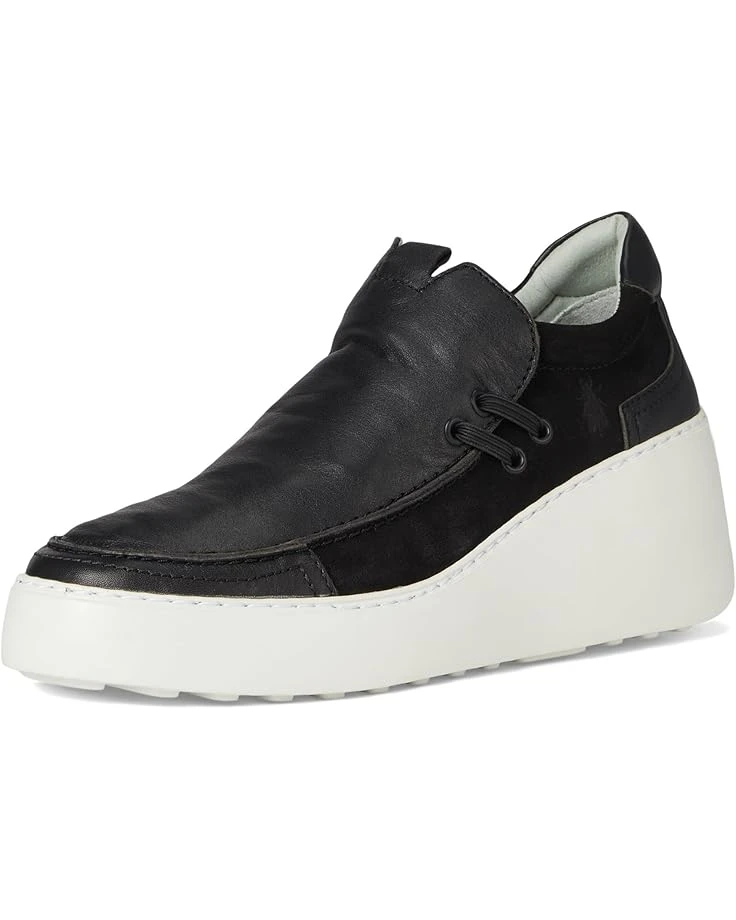 - This lightweight pull-on FLY LONDON® DAVY667FLY shoe is the ultimate in comfort. The rounded toe shape, genuine leather upper and fabric lining, and super cool wedge heel will have your feet feeling happy. The low-top shoes have padded foam insole for all-day comfort and slip-on closure for easy wear.