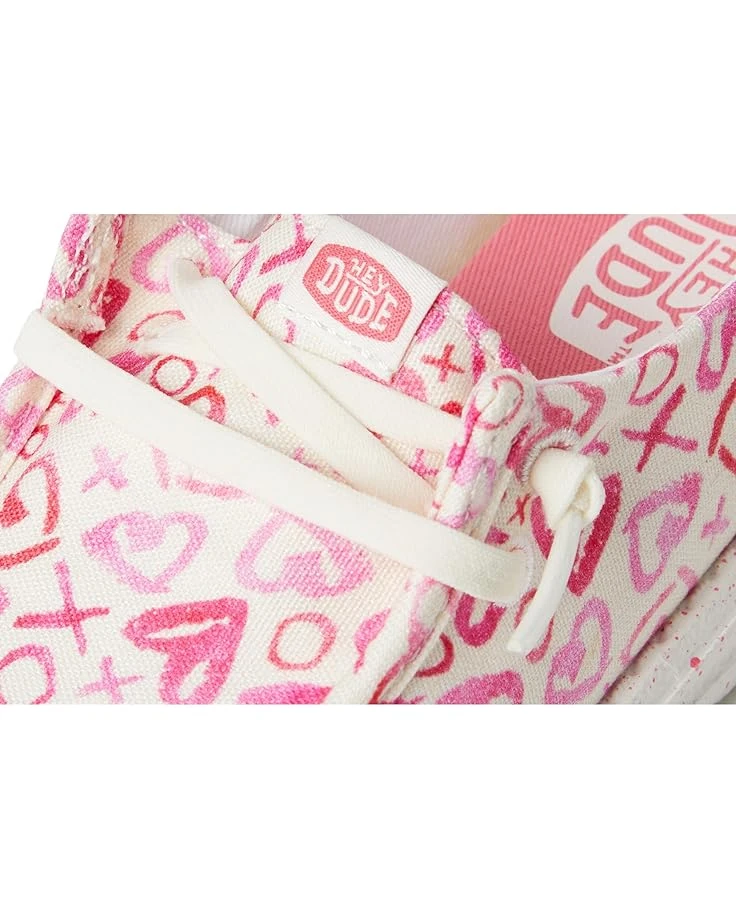 - Easy, breezy, textile makes this Hey Dude™ Kids Wendy Watercolor Hearts sneaker ready to roam. Easy-on elasticized laces, EVA outsole, and removable insole provide go-to comfort. Wendy provides everywhere comfort but with a style ideal for women who enjoy life’s ever-changing journey. The relaxed look and feel allow you to explore your passions and experience new places with the confidence your feet will fit into any occasion. The removable memory foam cushioned insole provides maximum comfort and reduces sweating and odors.