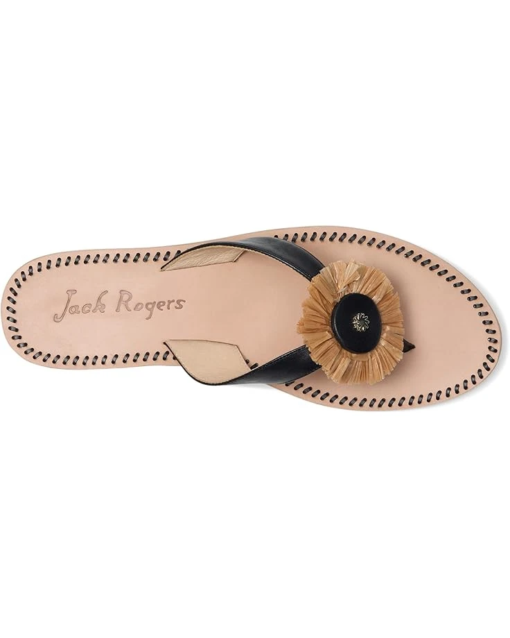 - Step into the tide, walk into adventure wearing the Jack Rogers® Cay Thong Sandal. Crafted from leather upper, lining, and insole, this pair of sandals features open round toe, chic black upper thong style strap, floral raffia medallion detailing, low stacked heel, and brand detailing on the footbed.