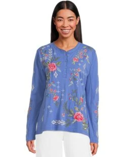 - The Johnny Was® Raw Seam Henley Top makes a great alternative for basic, everyday tees. This pull-on style comfortable top features a Henley neck with a quarter-button closure, long sleeves, a straight hem, and is finished with vibrant embroidered detailing for a splash of color.