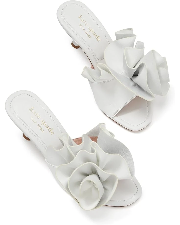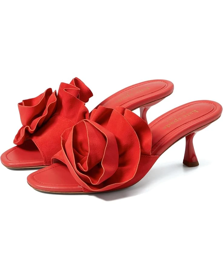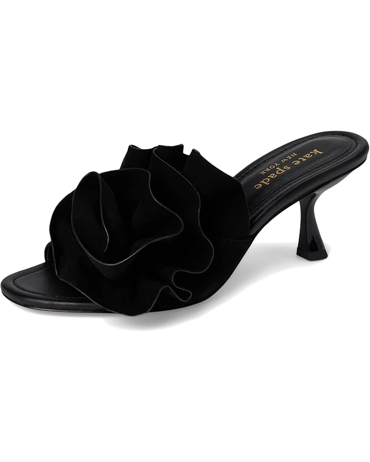 - Up your footwear game adding this Kate Spade New York® Flourish slip-on to your collection. It has leather upper with a 3D flower strap and slide on style. Lined with leather the slip on features open toe, leather insole and wedge platform.