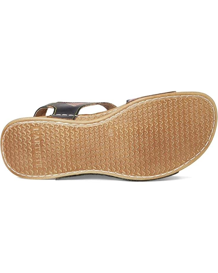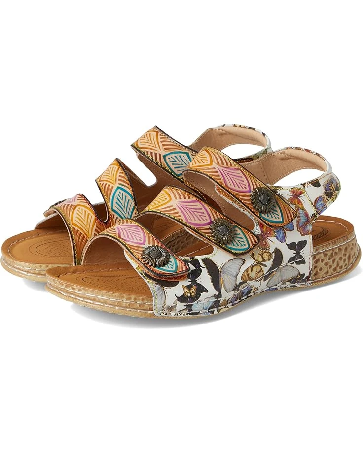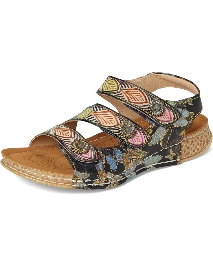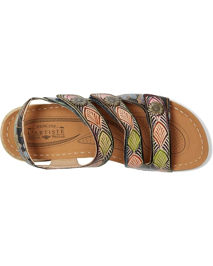 - The L’Artiste by Spring Step® Versa sandals are more than just a sandal – they are a luxurious retreat for your feet. Their flexible design and plush padding mold to your unique contours, cradling you in blissful relaxation. Meanwhile, the hand-painted leather straps and metallic butterfly accents elevate your look, transforming the ordinary into the extraordinary. These strappy sandals are crafted with a faux leather insole and lining. The leather upper features three hook-and-loop straps for a secure fit.