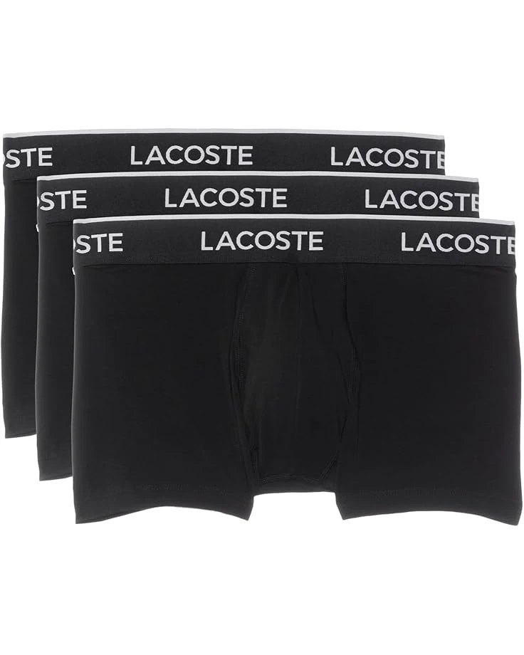 - The LacosteĀ® Cotton Stretch Essentials Trunks 3-pack offer all-day comfort and support for various activities. These feature a comfortable mid-rise elastic waistband and a soft brushed interior that prevents irritation when worn. The allover branded waistband with contrasted wording and stripe on top adds an authentic touch.These are expertly designed to provide a secure fit that stays in place without pinching or discomfort.