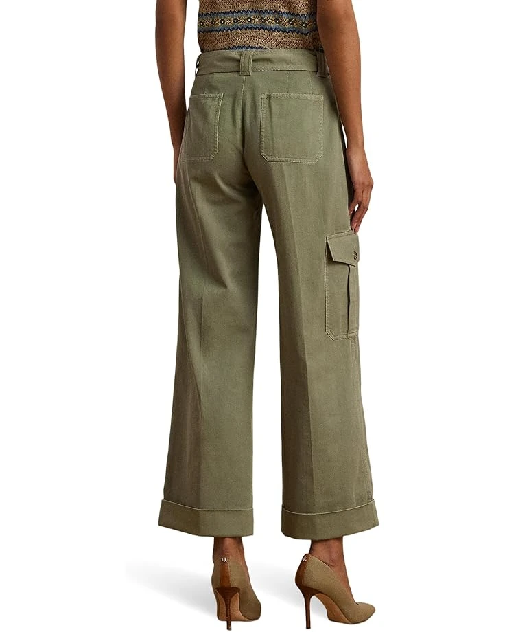 - Lauren Ralph LaurenĀ® elevates the quintessential Cotton Twill Wide-Leg Cargo Pants with a chic wide-leg silhouette and crisp creases at each leg. Lightweight cotton twill offers a comfortable, structured fit, while folded cuffs, waist darts, and signature horn effect buttons provide added sophistication. The pants feature a high-rise waist, regular fit, two front waist patch pockets, two back waist patch pockets, and a side buttoned-flap cargo pocket at the right knee.