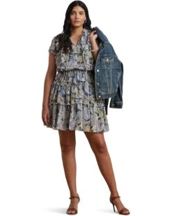 - Featuring an allover floral print, the Lauren Ralph Lauren® Plus Size Devany Short Sleeve Day Dress is a perfect choice for parties and special occasions. The elasticized waistband offers a flattering fit while the ruffle detail at the back adds to its style. Made from polyester fabric, this printed dress is styled with short flutter sleeves, a collared neckline with a tie closure, and a tiered skirt.
