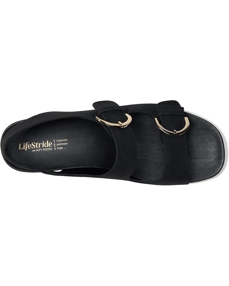 - The LifeStride® Goodie Sandals blend versatility and style for comfortable everyday wear. The open-toe sandals are crafted with a double-strapped polyester upper, partially recycled polyurethane lining, and a foam insole with Trusted Soft System® comfort technology for unmatched cushion, support, & flexibility. The double hook-and-loop strap ensures a customized fit and the two decorative buckles elevate the style.