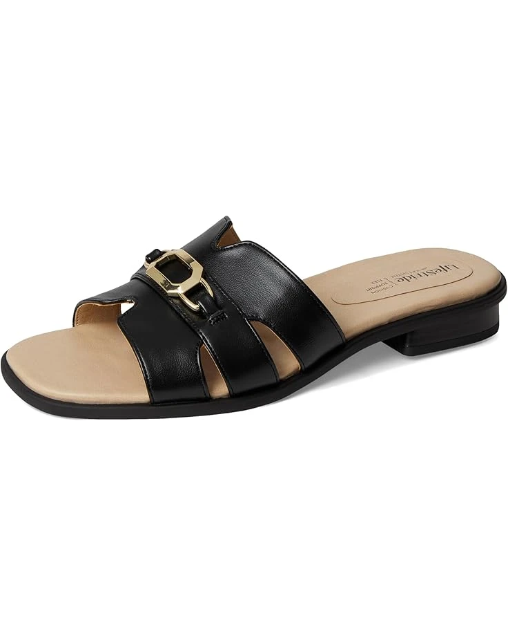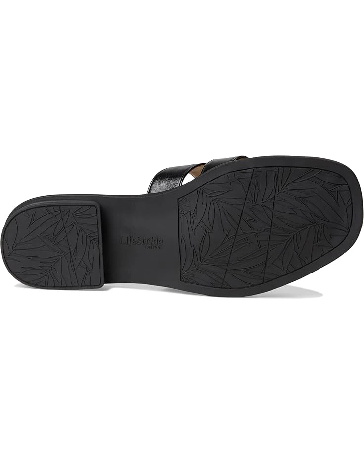 - Perfect for travel or every day, the LifeStride® Royaltybit sandals are equally versatile, casual, and chic. Their polyester upper features an open square toe silhouette, slip-on fit, and metallic ornament detail while the trusted Soft System® comfort technology provides unmatched cushion, support, and flexibility in every pair. These heeled sandals are made of a foam insole and polyurethane lining. The traction synthetic rubber outsole offers extra stability.