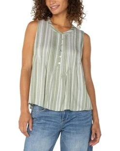 - From casual to classy, the Liverpool™ Los Angeles Sleeveless Popover Button Front Woven elevates your everyday style. This top features scoop neckline, popover button front, pull-on style, and straight hem. It is designed with green white variegated stripes and pintucks that add a touch of elegance to any outfit.