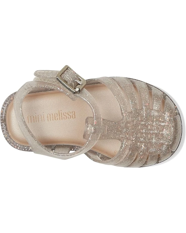 - Let your baby walk wobbly and look cute in the garden wearing Mini Melissa® Possession Shiny BB footwear. It is crafted from PVC and metal upper, in a T-strap vamp design with adjustable ankle and buckle closure. The footwear features Grenflex insole and water resistant construction. A glitter effect brings glamour and festive vibe to the little first steps of your child.