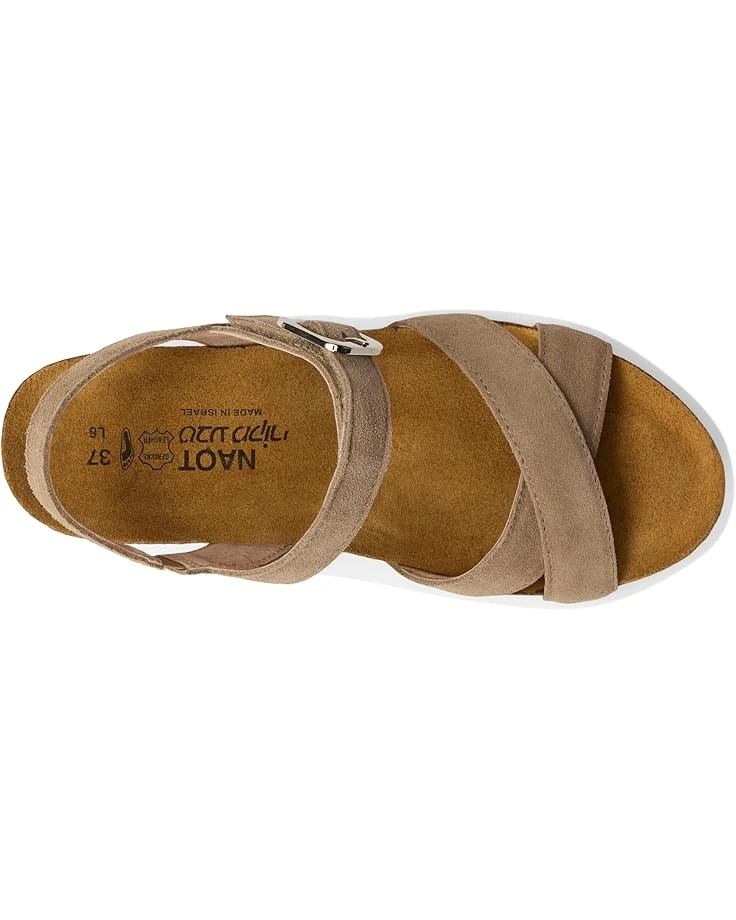 - Let your feet enjoy a luxurious feel in sumptuous style as you wear the Naot® Throne Wedge Heels. This almond toe pair features leather upper and lining construction with cork and latex covered in suede footbed. The ankle strap has hook-and-loop closure with decorative buckle design.