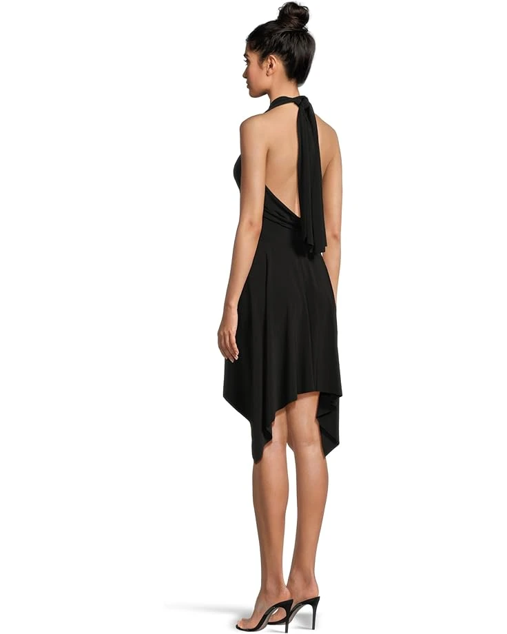 - Solid convertible dress can be worn as a V-neck, halter, one shoulder, or strapless.