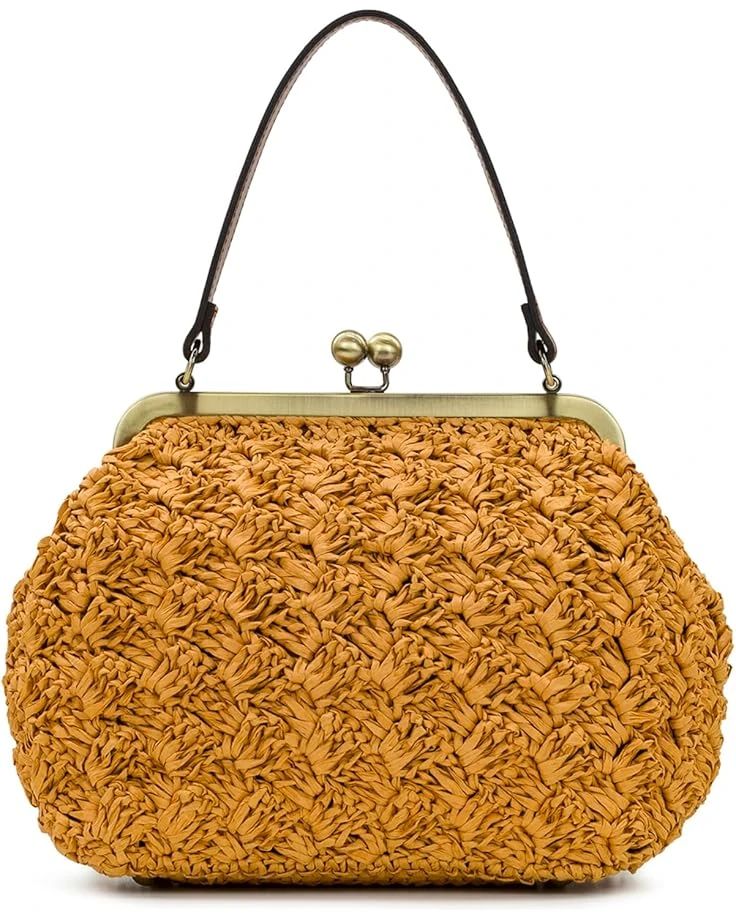 - Look classy and stylish carrying this charming Patricia Nash™ Elara Frame. Crafted from straw, this bag features kiss-lock closure, one zippered interior pocket, two interior slip pockets, one exterior protective metal feet, leather trim with burned edge finish, and Signature brushed brass hardware, heavy handcrafted stitching.