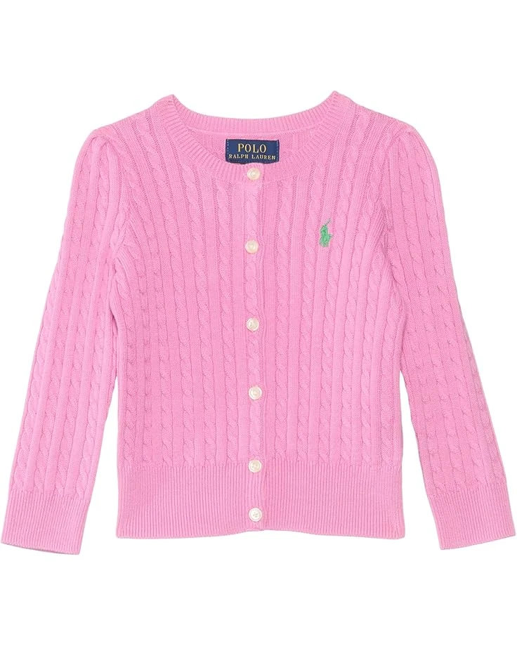 - Cozy up and look pretty as a flower in the Polo Ralph Lauren® Kids Cotton-Mini Cable-Tops-Sweater. The cable knit sweater features a crew neck, a full-button closure, a signature pony detail at the left chest, long sleeves, a straight hem, and a ribbed trim.
