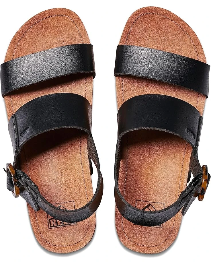 - Keep it stylish walking comfortably in the ankle-back Reef® Vista Hi Buckle flip-flop sandals. Super soft unlined PVC-free vegan leather two-strap slide made with rPET. It has a wide shape round-toe silhouette with generous arch support and heel cupping with natural cork cover. It features a lightweight and durable EVA outsole with a platform silhouette and added lug design for traction.