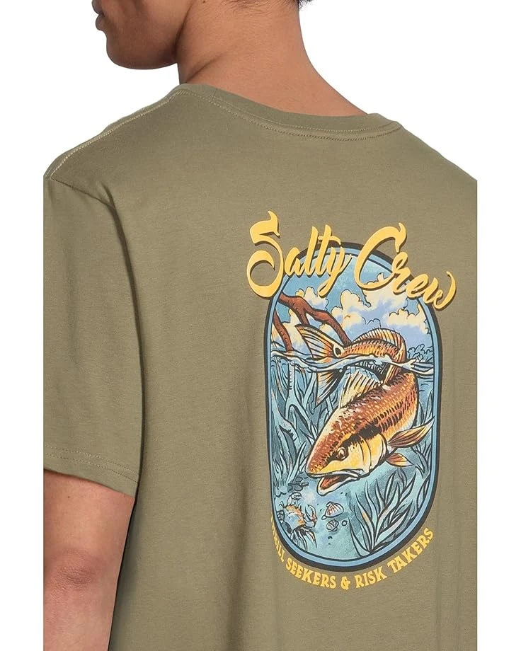 - Upgrade your basics with the Salty CrewĀ® Bruce Short Sleeve Tee. This tee features crew neckline, short sleeves, cool graphic print on the back, brand logo on the front left chest, and straight hem.