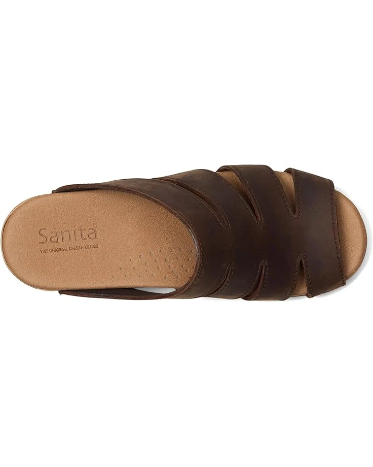 - Made with a super durable, shock-absorbent polyurethane rocker-bottom outsole, the Sanita® Monika sandals are APMA-approved and easy to slip on and off. These heeled sandals are made of a leather upper and lining. The anatomically correct footbed with breathable cushioned microfiber insole makes them comfortable to wear for long hours.