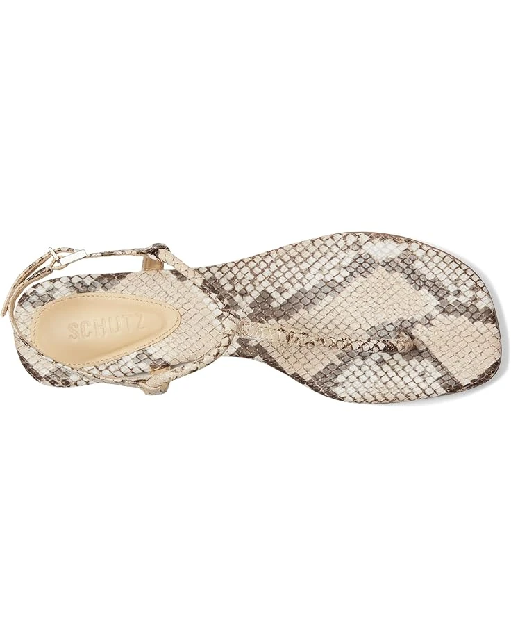 - Glamorize in metallic gleam wearing the Schutz® Elsha Sandals. The square toe thong features metallic leather upper with buckle adjustable slingback strap closure and toe-post strap for a comfortable hold.