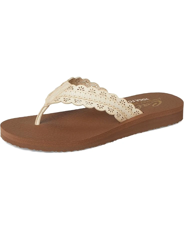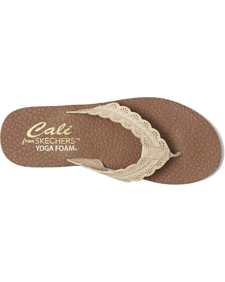 - Get ready to embrace comfort and style, every step of the way donning SKECHERS® Cali Meditation – Catching Sun, where comfort meets chic. Designed to help you find your center, these flip-flop sandals feature a gorgeous scalloped floral laser-cut upper, blending pretty style with lasting comfort. The YOGA FOAM® footbed gently supports your every step, making it feel like you’re walking on clouds. The EVA upper and outsole, paired with synthetic rubber lining, offer durability and stability while keeping the look light and airy. With easy slip-on convenience and stitching accents for a touch of flair, these sandals are the perfect companion for your sunny-day adventures.