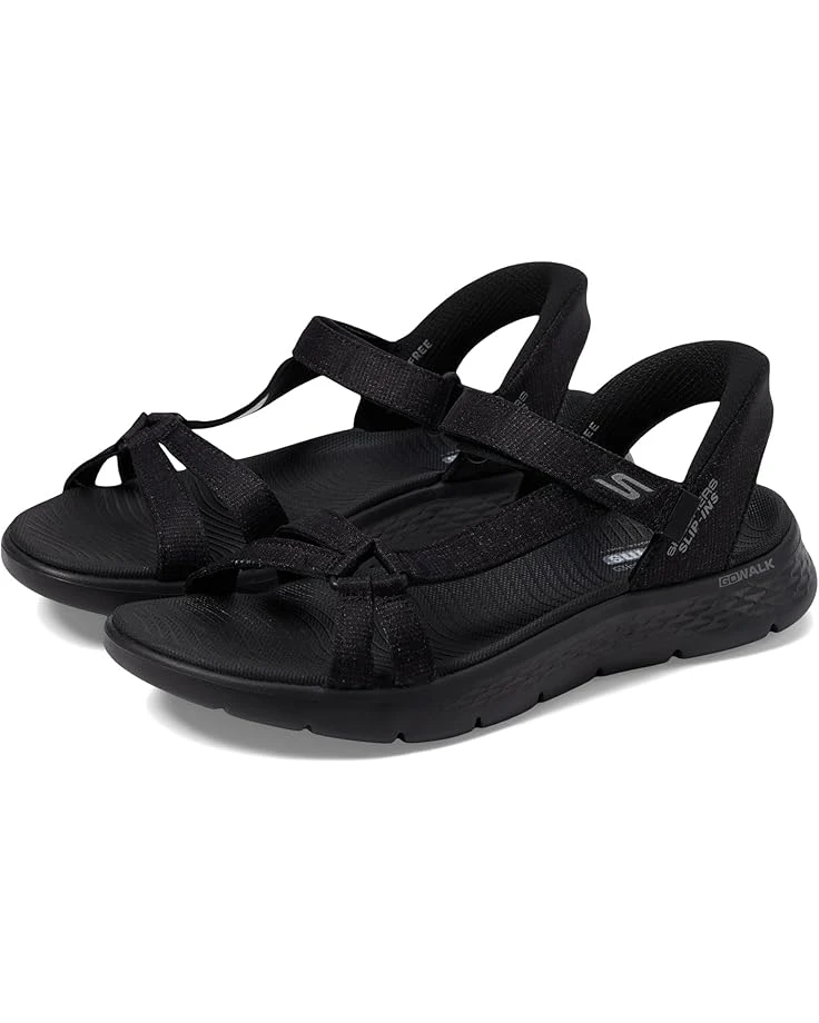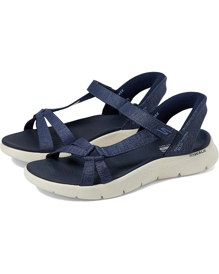 - Step smart, step clever wearing the SKECHERS® Performance GO WALK Flex Sandals – Illuminate Hands Free Slip-Ins. Crafted from vegan materials, this pair of sandals features heathered mesh upper with adjustable instep strap, mesh lining and EVA insole. It has open round toe, hook-and-loop closure, back heel piece, Skechers Hands Free Slip-ins® for an easy fit, Heel Pillow™ holds your foot securely in place, contoured Goga Mat® comfort footbed and lightweight, responsive ULTRA GO® cushioning.