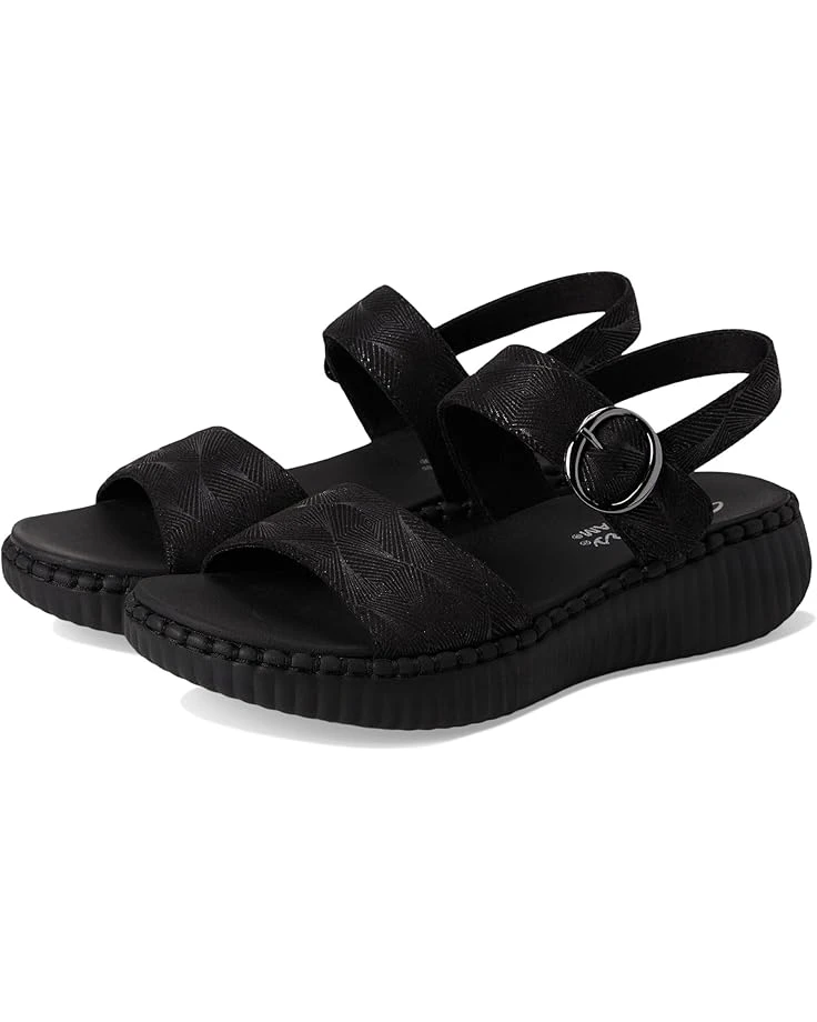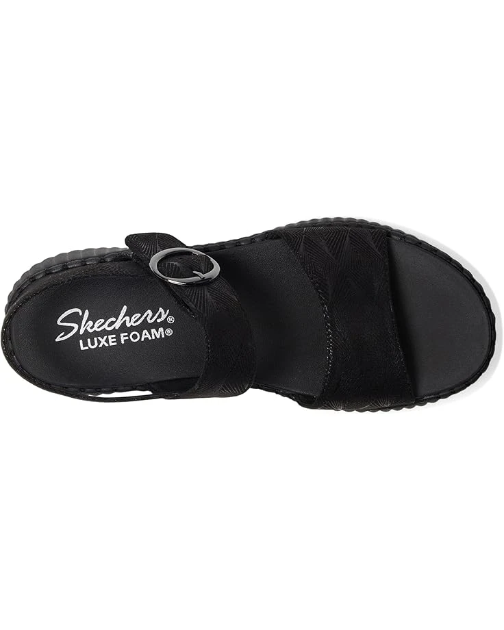 - Enjoy sunny days in breezy comfort with Skechers® Wilshire BLVD – Illusion of Love. Crafted from textured vegan shimmer suede upper with adjustable strap and buckle, this pair of sandals features open round toe, luxe foam cushioned comfort footbed, midsole stitching trim, low heel, and brand detailing on the footbed.