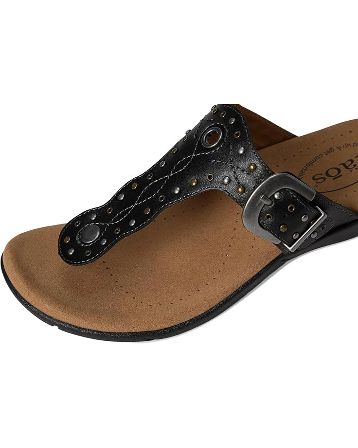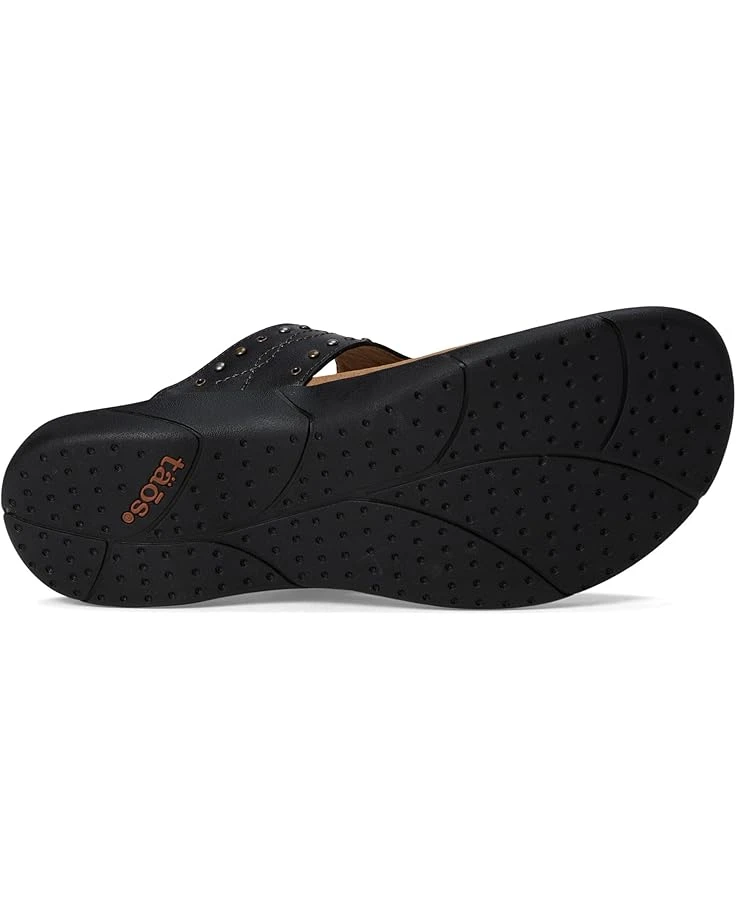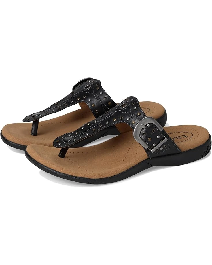 - With lovely embroidery, delicate rivet, grommet detailing, and an antiqued adjustable buckle, the Taos® Footwear Flash sandals have just enough bling to compliment any outfit! They feature a slip-on style and Soft Support™ footbed with amazing arch support and a cooling Recovery Foam® microfiber-covered polyurethane insole. These T-strap sandals are made of a full-grain leather upper and microfiber lining. These sandals are so comfortable you’ll never want to take them off.