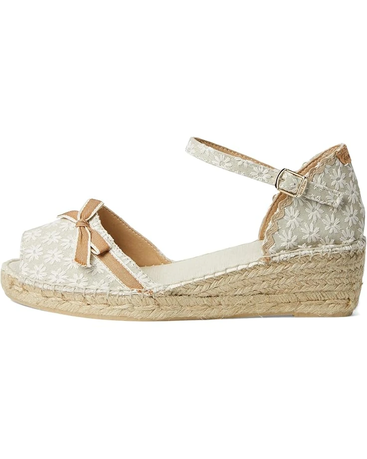 - The Toni Pons® Diana sandals are sweet peep toe shaped espadrilles that are styled with a delicate bow and subtle floral print. These heeled sandals are crafted with a rubber upper, jute midsole, cotton insole, and cotton lining. The ankle strap with an adjustable buckle closure offers a secure fit. Comfortable and stylish, these espadrilles are perfect to pair with your casual outfits and dresses.