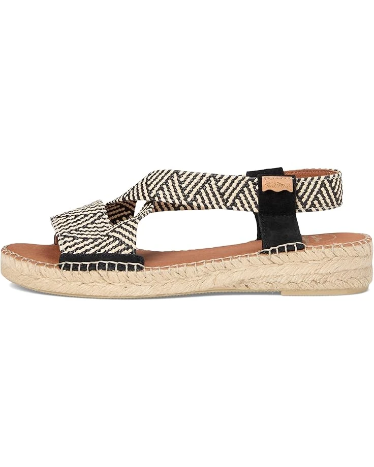 - Make a swanky appearance wearing the Toni Pons® Eliana. Crafted from rubber upper, leather lining, and leather insole, this pair of sandals features open round toe, wedge heel, braided fabric strappy upper, slingback strap with hook-and-loop closure, and brand detailing on the footbed.