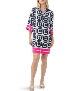 - Love the joy of dressing yourself in this beautiful Trina Turk™ Argina Dress. It features a button-up V-neck and vibrant geometric print pattern allover for a stand out look. Falling above the knee, it offers a flattering length for any occasion. The pointed collar and three-quarter wide sleeves add a refined detail.