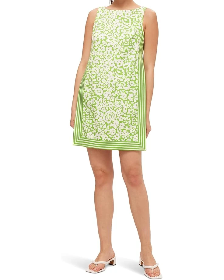 - The Trina Turk™ Brynee 3 Dress is a sleeveless shift silhouette featuring a boat neckline and a striking contrast border to add to its charming finesse. The side slits designed with panels underneath, provide a refined look. Adorned with an allover floral print, this dress is a beautiful blend of style and comfort.